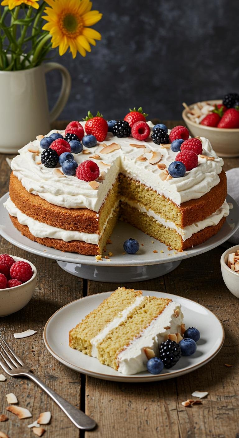 - Before serving, spread chilled coconut whipped cream over the top and garnish with berries or toasted coconut if desired.
