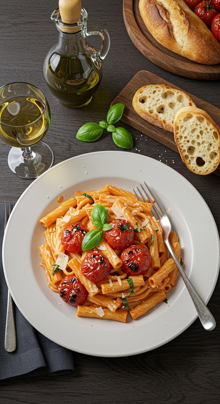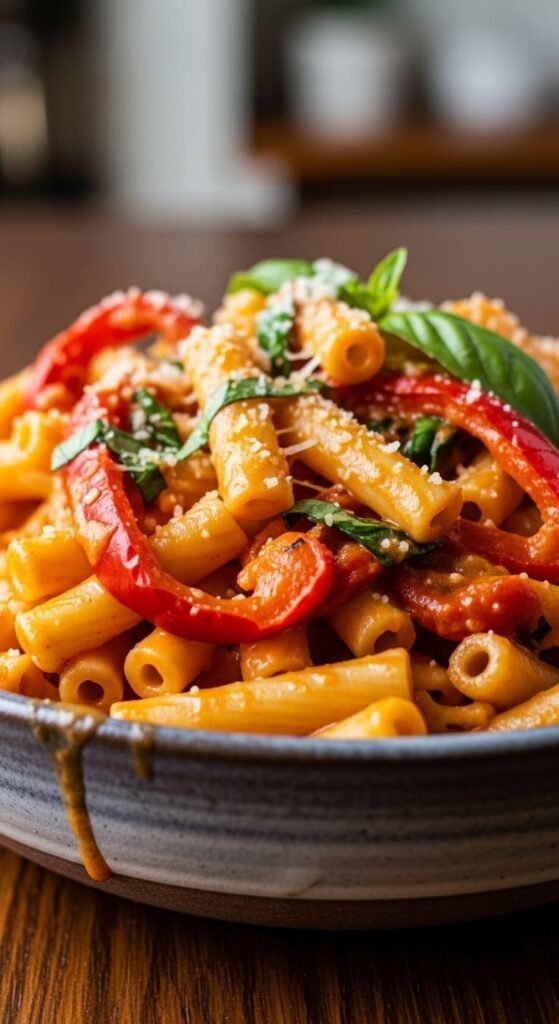 Dig in and enjoy a velvety, smoky plate of roasted red pepper vodka ziti — comfort food with a bright twist!