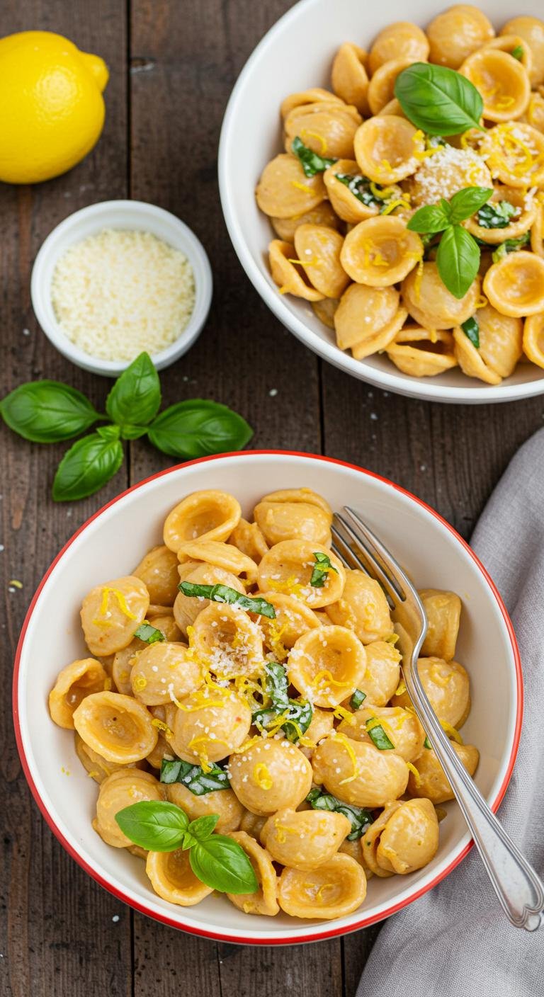 Bright, bright lemon and fragrant basil meet creamy vodka sauce on little ear-shaped orecchiette for a light, zesty weeknight winner.