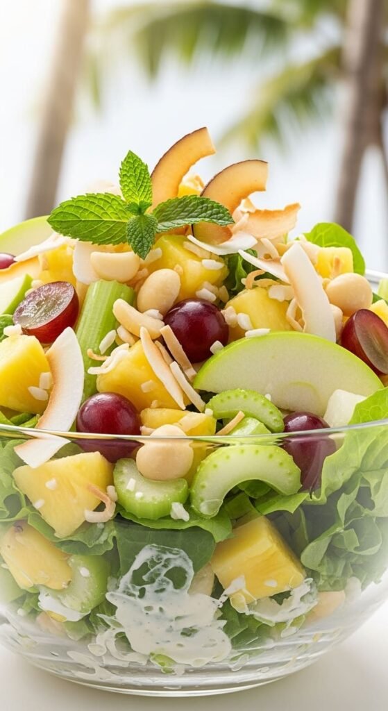 Bright, breezy Tropical Waldorf with pineapple, coconut, and macadamias — a crunchy, creamy island twist on a classic.