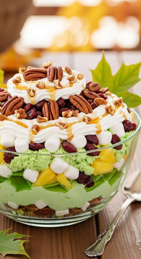 A cozy, autumnal twist on the classic Watergate Salad with maple sweetness and crunchy pecans.